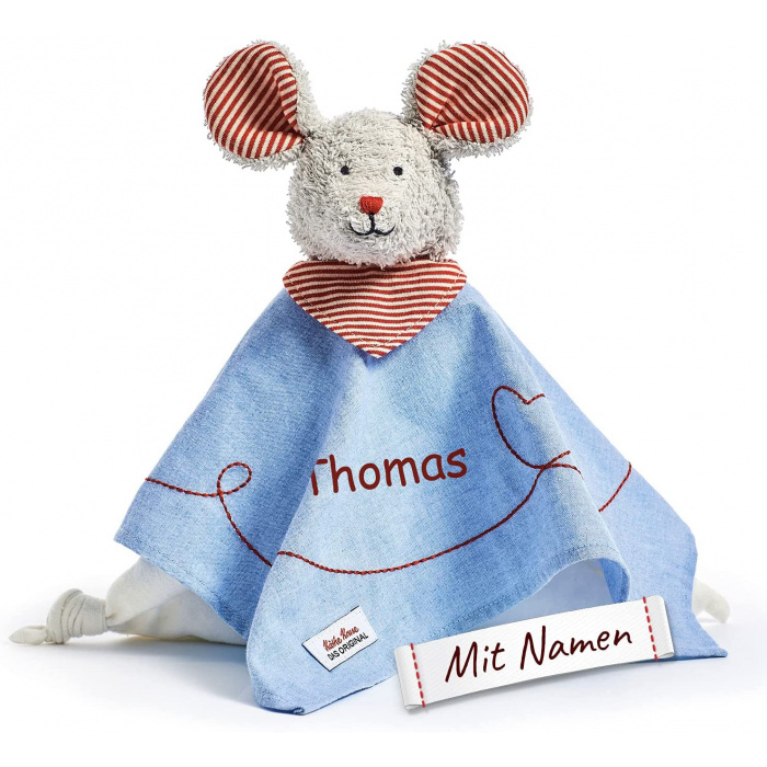 KÄTHE KRUSE Maus Robin Schmusetuch mit Namen personalisiert (hochwertig BESTICKT, nicht bedruckt) für Neugeborene, Babys und Kleinkinder. Ideal für Babyschale, Gitterbett und Kinderwagen und ein schönes Willkommensgeschenk für Babys. IDEALES GESCHENK für Junge und Mädchen - ein Schmusetuch zur Geburt, Geburtstag, Ostern, Weihnachten oder Taufe für Kinder von 0-3 Jahren geeignet. Leicht und handlich für kleine Kinderhände. Material: Nicki, Baumwolle