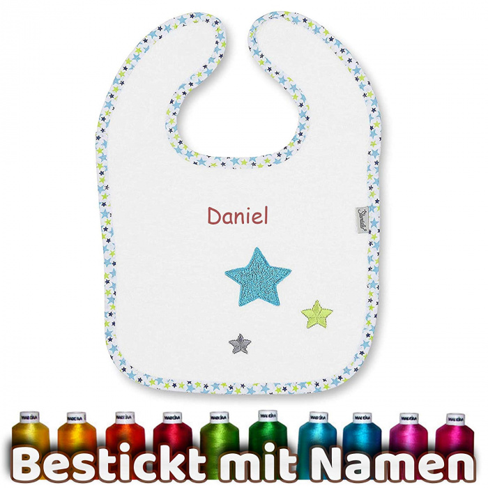 WEICHES Lätzchen von STERNTALER bestickt mit Namen aus angenehmem Frottee Baumwollstoff für Baby und Kleinkind mit Sterntaler Motiv Sterne, Model “Erik”. Ein praktischer Klettverschluss am Lätzchen Spucktuch garantiert perfekten Sitz.